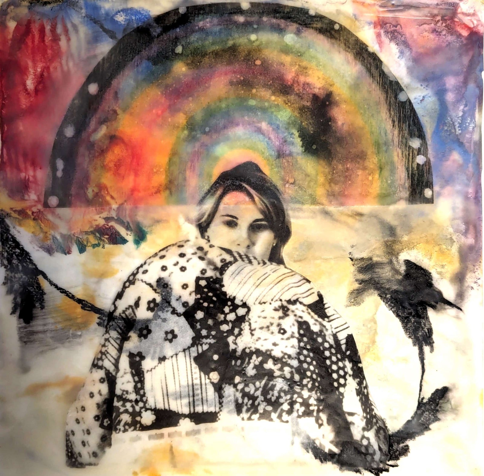 Rainbow Bridge portrait commissions feature an image of your pet preserved in beeswax medium on a wooden panel adorned with rainbow imagery.