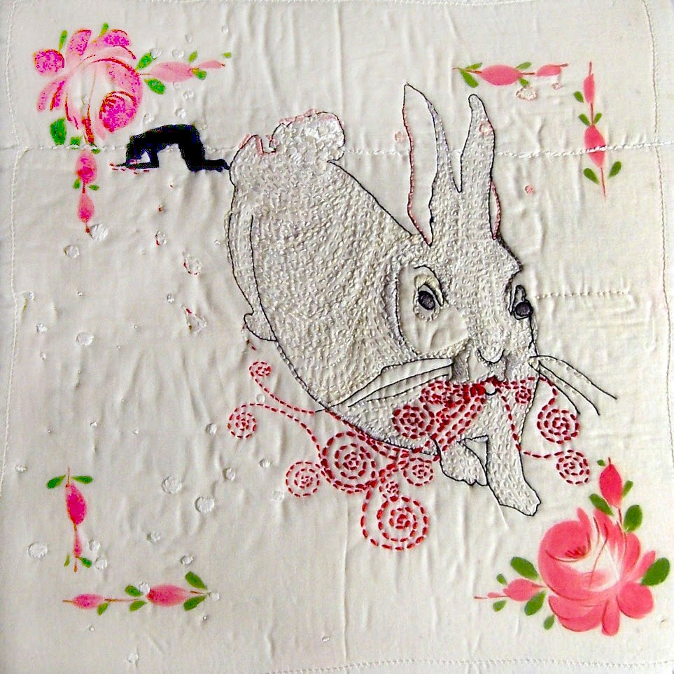 'Killer Bunny' 2007 Embroidery on vintage handkerchief