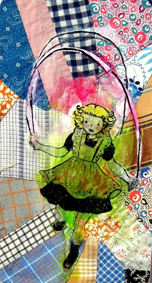 'Ghost Girl' 2010 Acrylic image transfer on found quilt mounted on wood