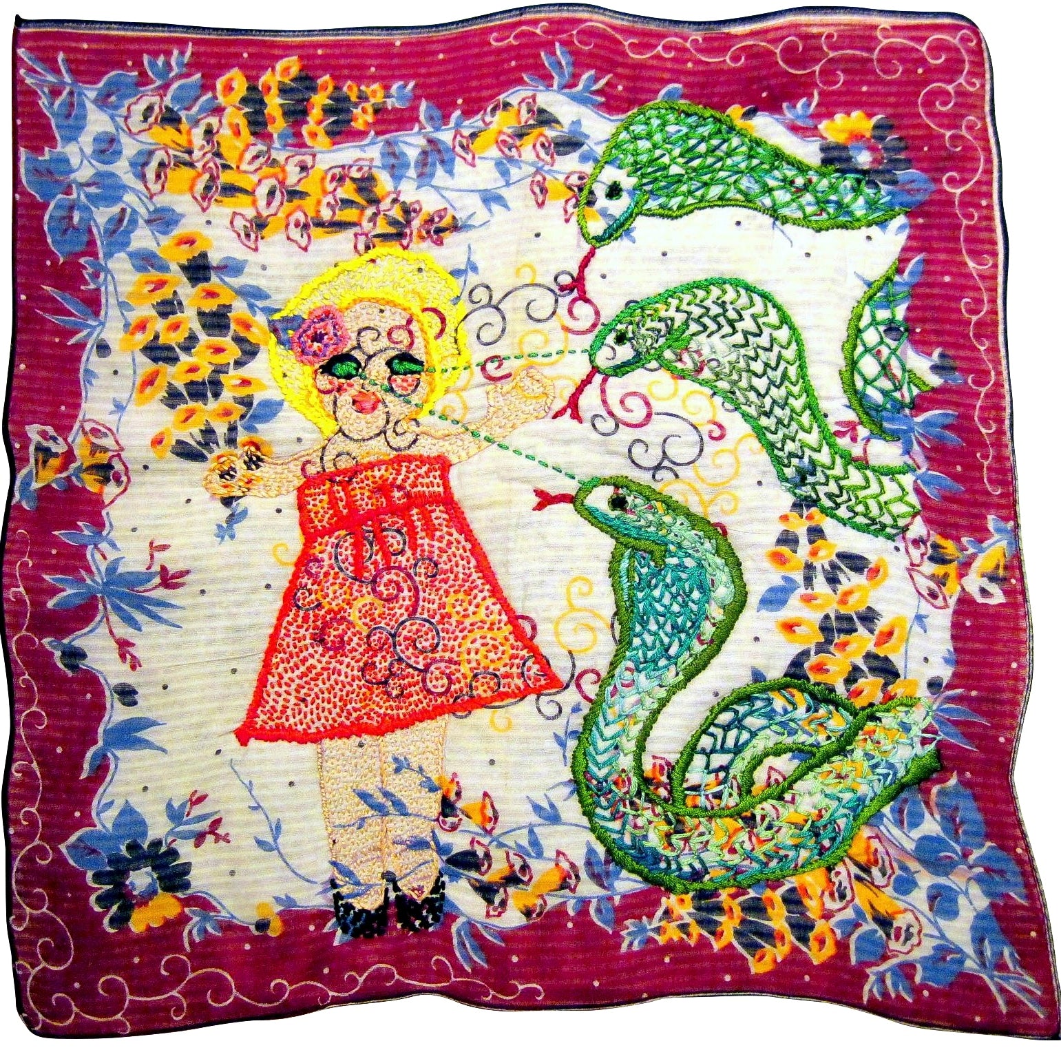 'Kewpie vs Cobras' 2008 Embroidery thread and vintage handkerchief