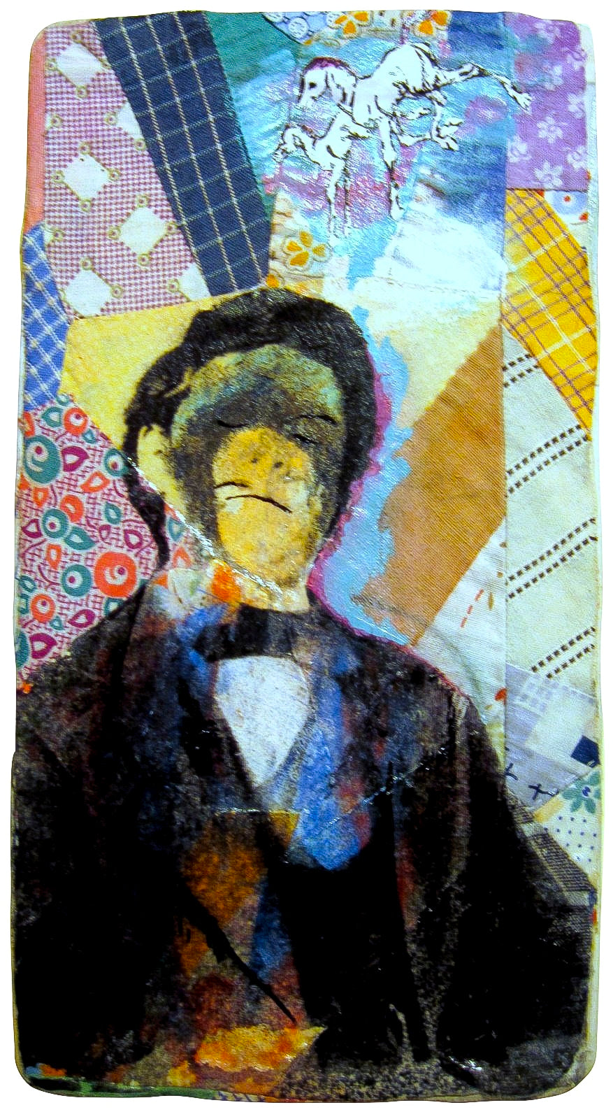 'Ghost Boy' 2010 Acrylic image transfer on found quilt mounted on wood