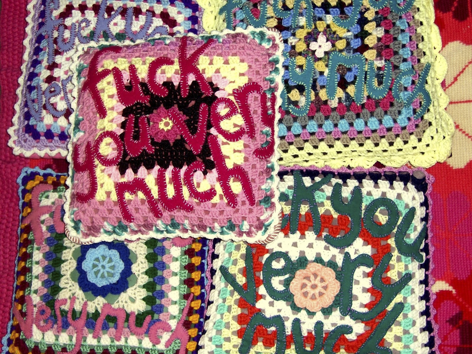 Pillows for pillow fights. Embroidered and appliqued vintage pillows. Art of Comedy at Comedy Underground Seattle 2007