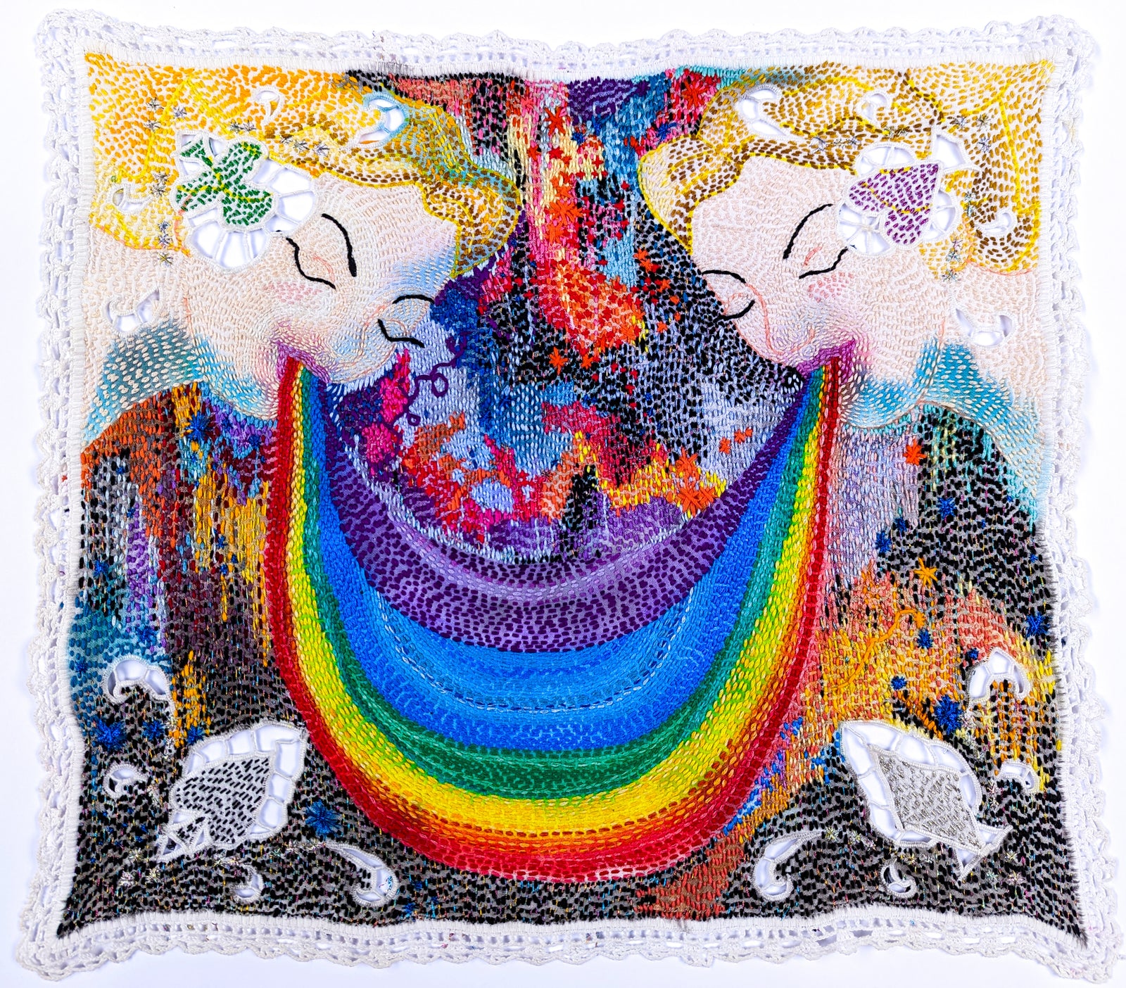 'The Norns' 2022 Dye & embroidery on vintage table runner