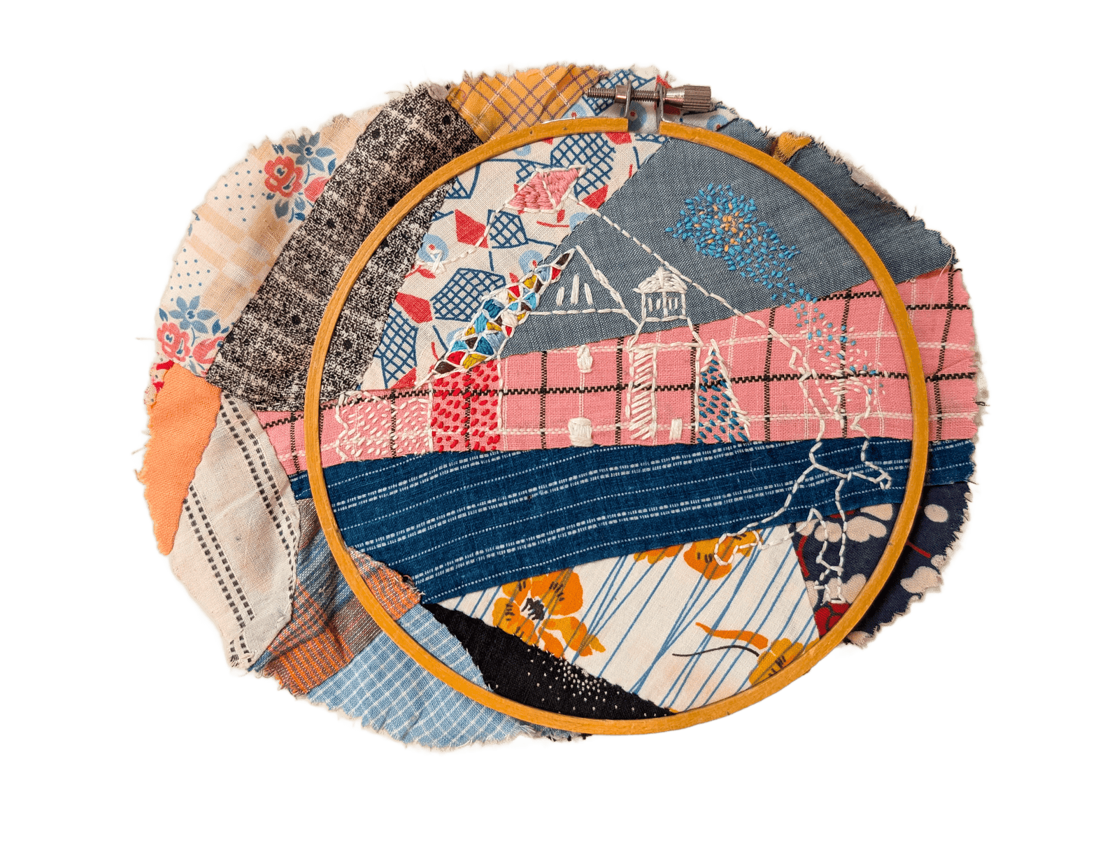 Honoring and collaborating with found textiles to give them a second life. Drawing with thread and making alternative canvases.