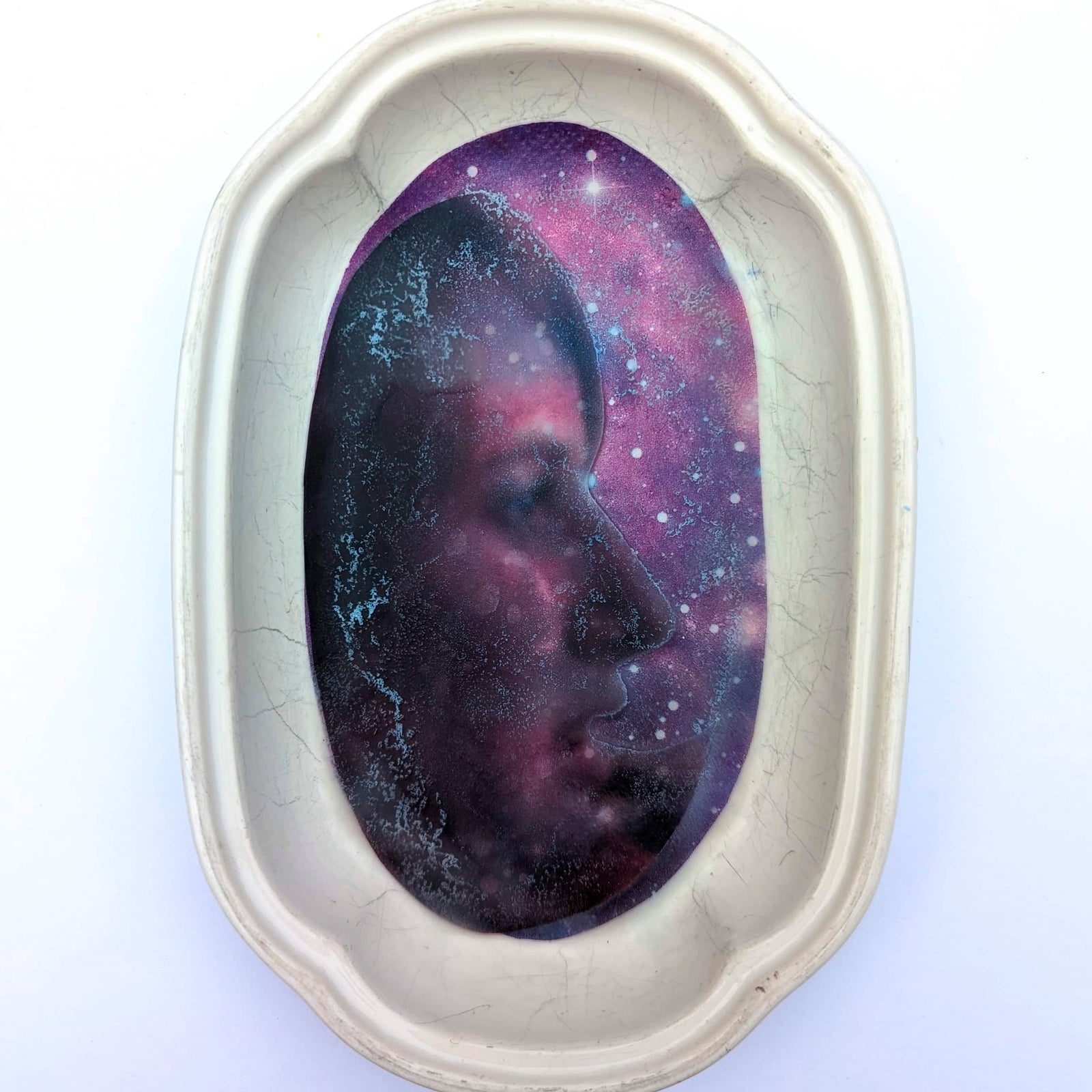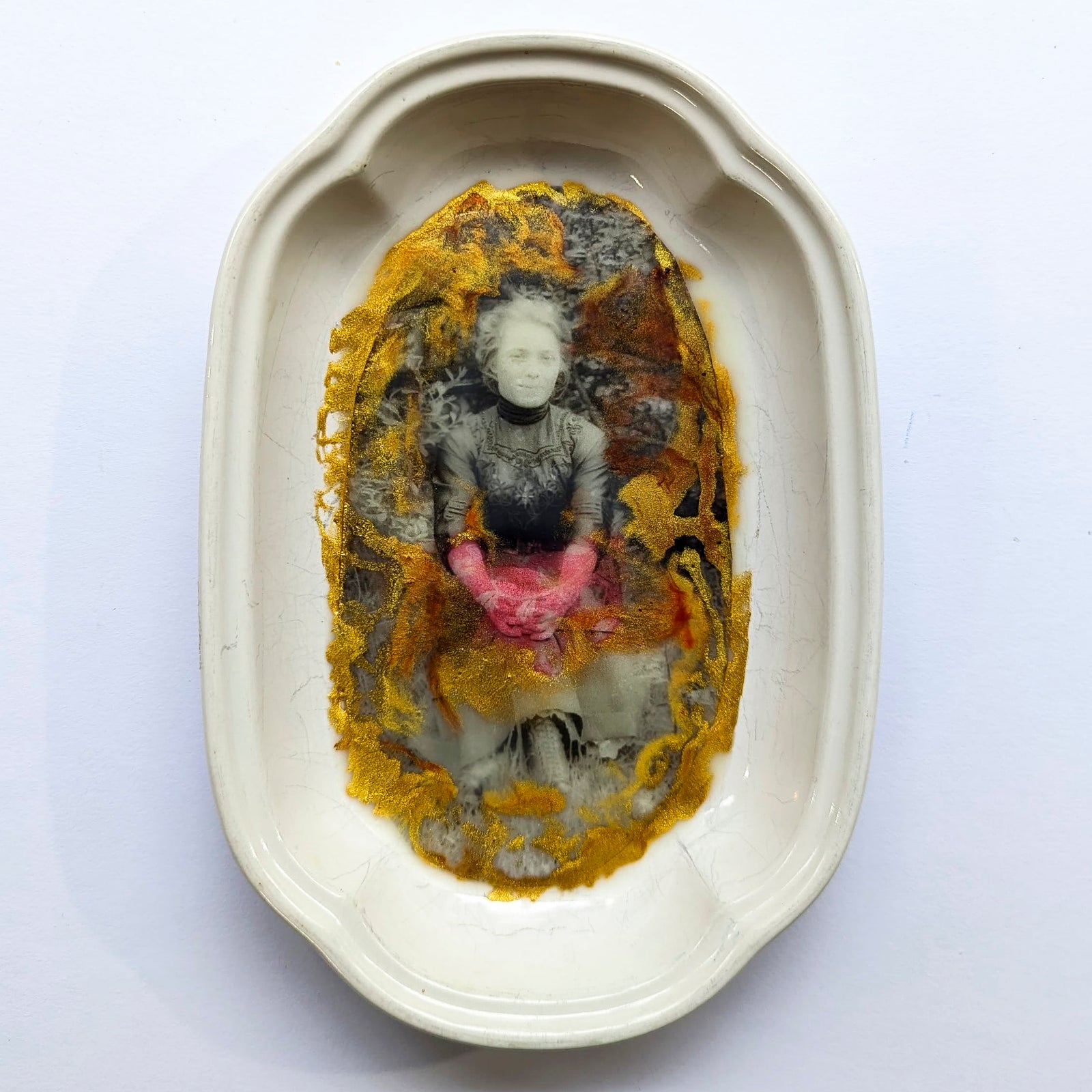 'Mom Looking Dreamy' 2024 Encaustic collage on ceramic dish