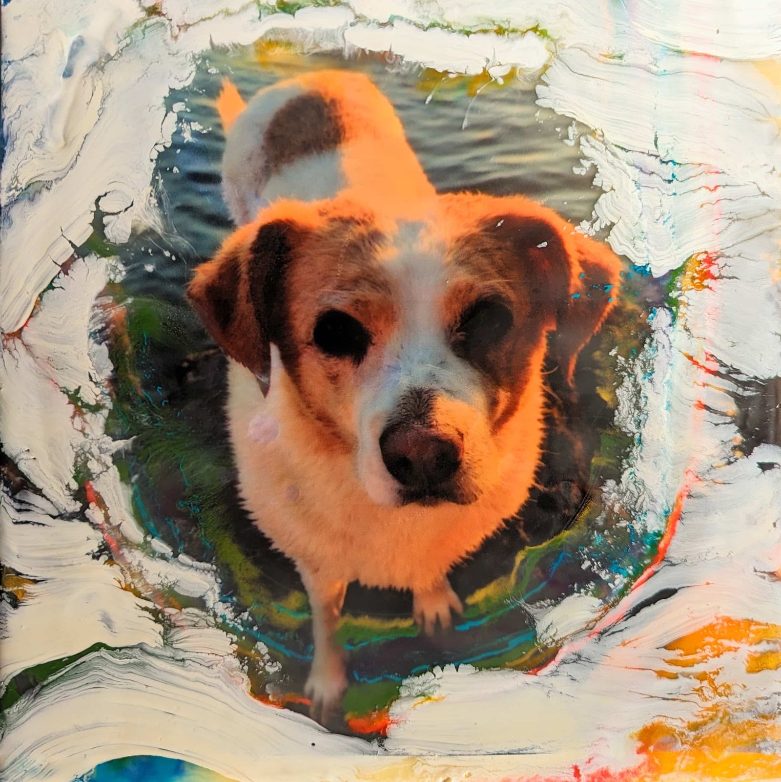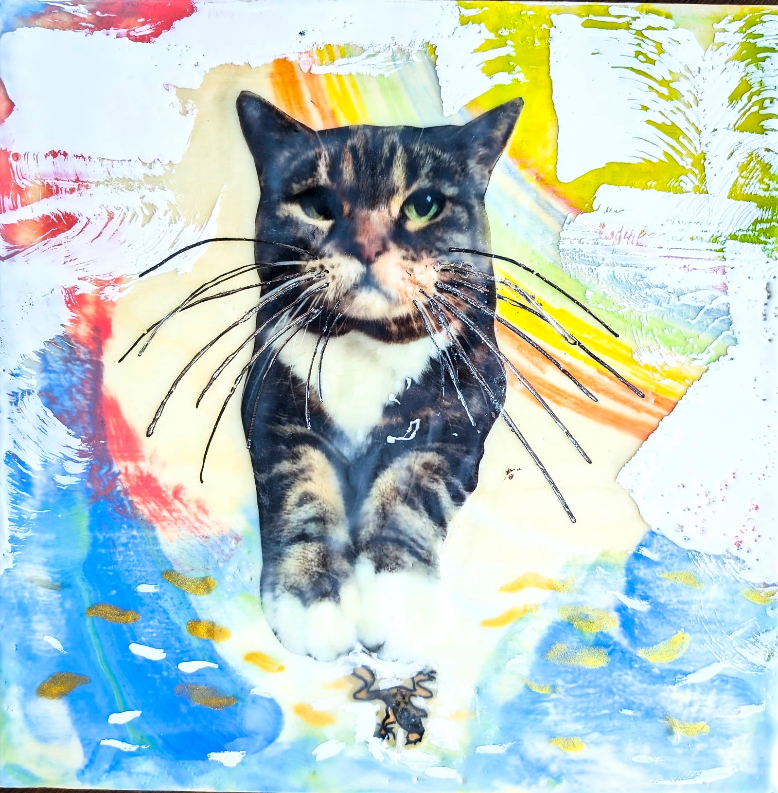 'Cousin Astraia's Dancing Freckles' 2024 Encaustic collage on wood