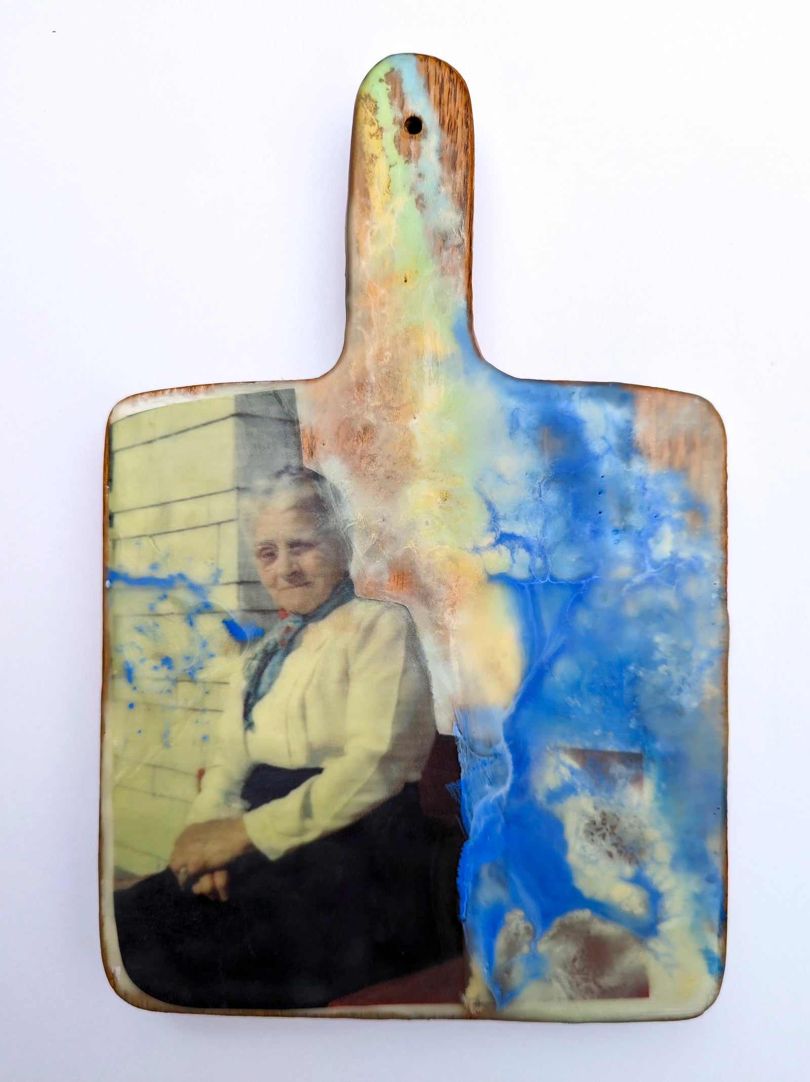 'Great Grandma Looking Dignified' 2024 Encaustic collage on found object