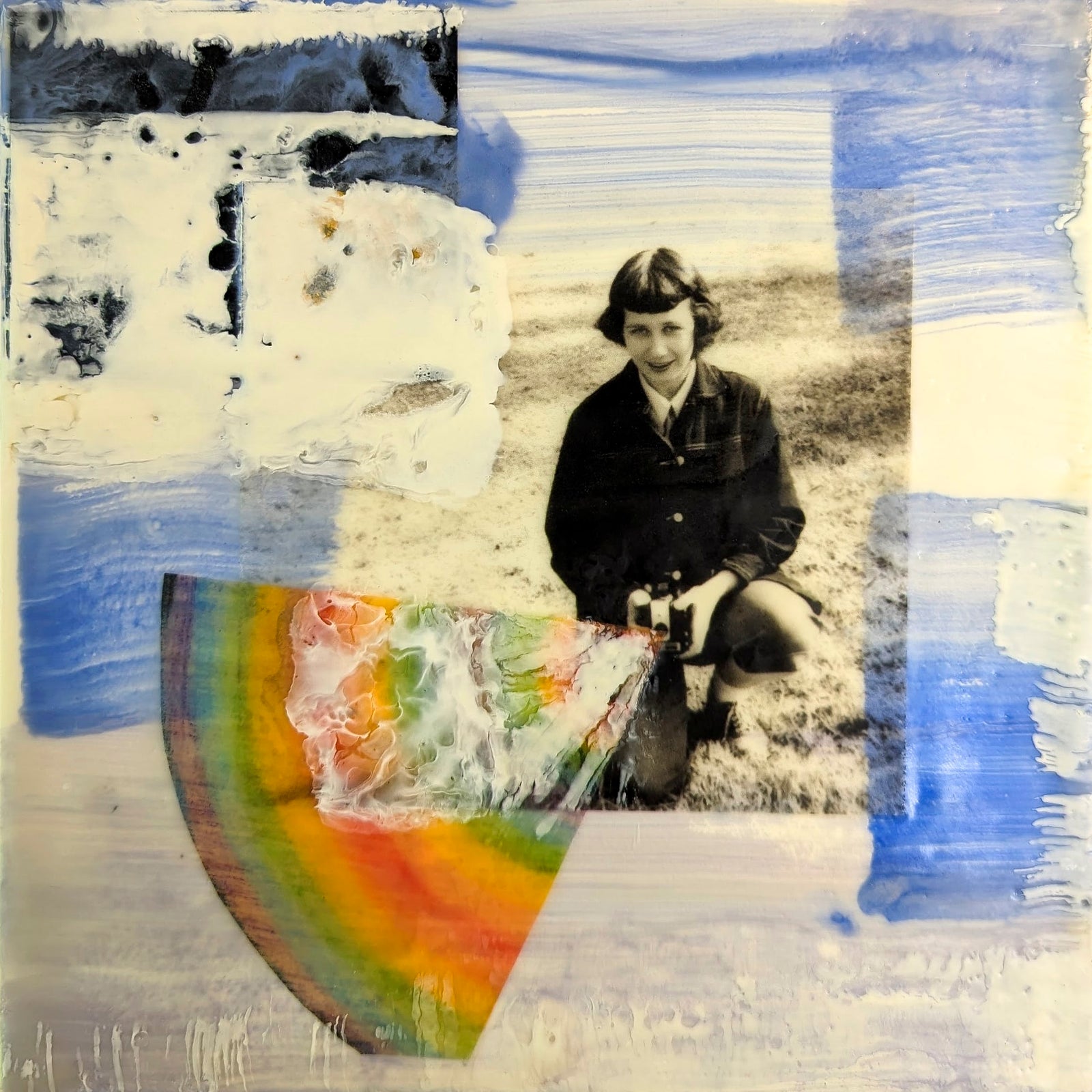 'Grandma Ann with Her Camera' 2024 Encaustic collage on masonite