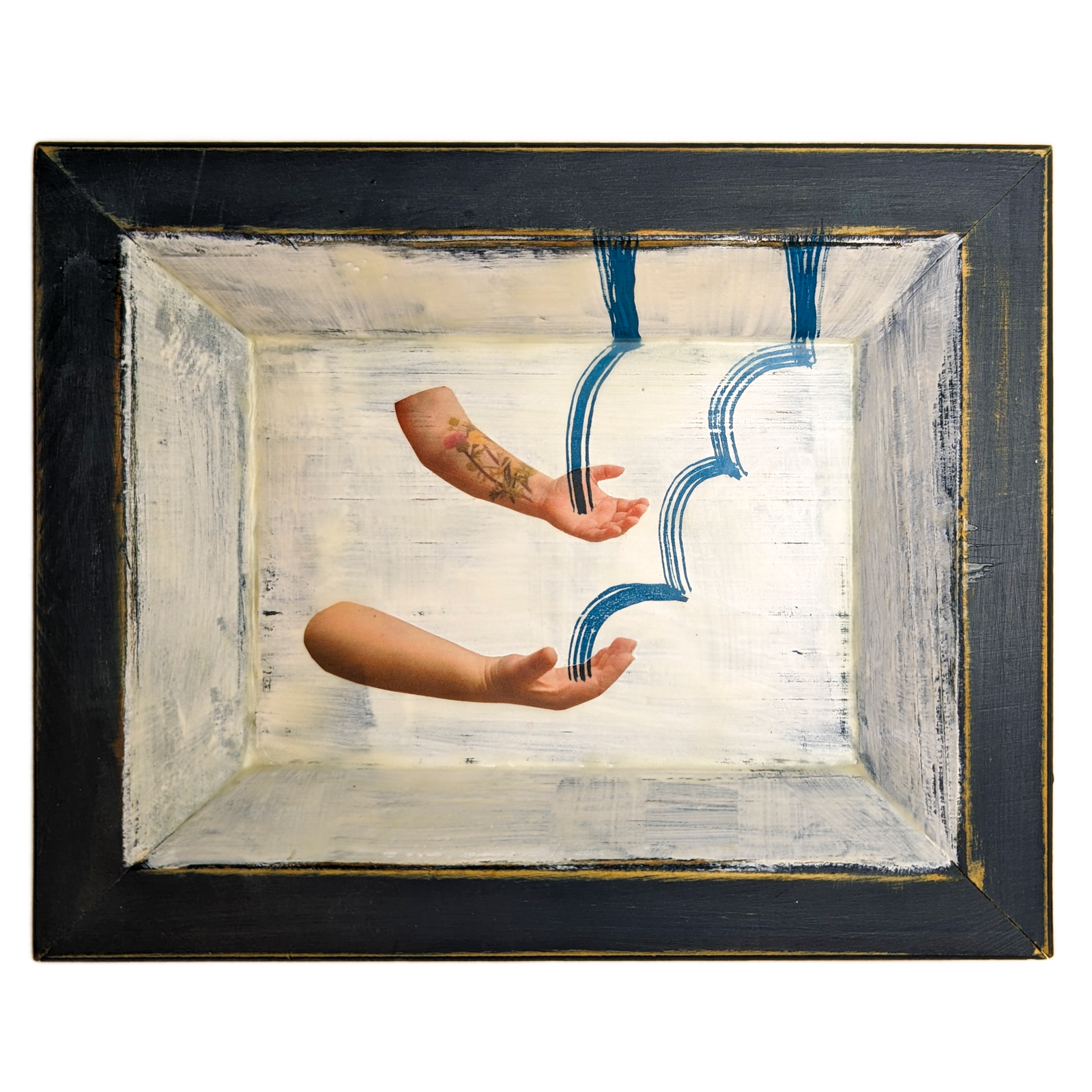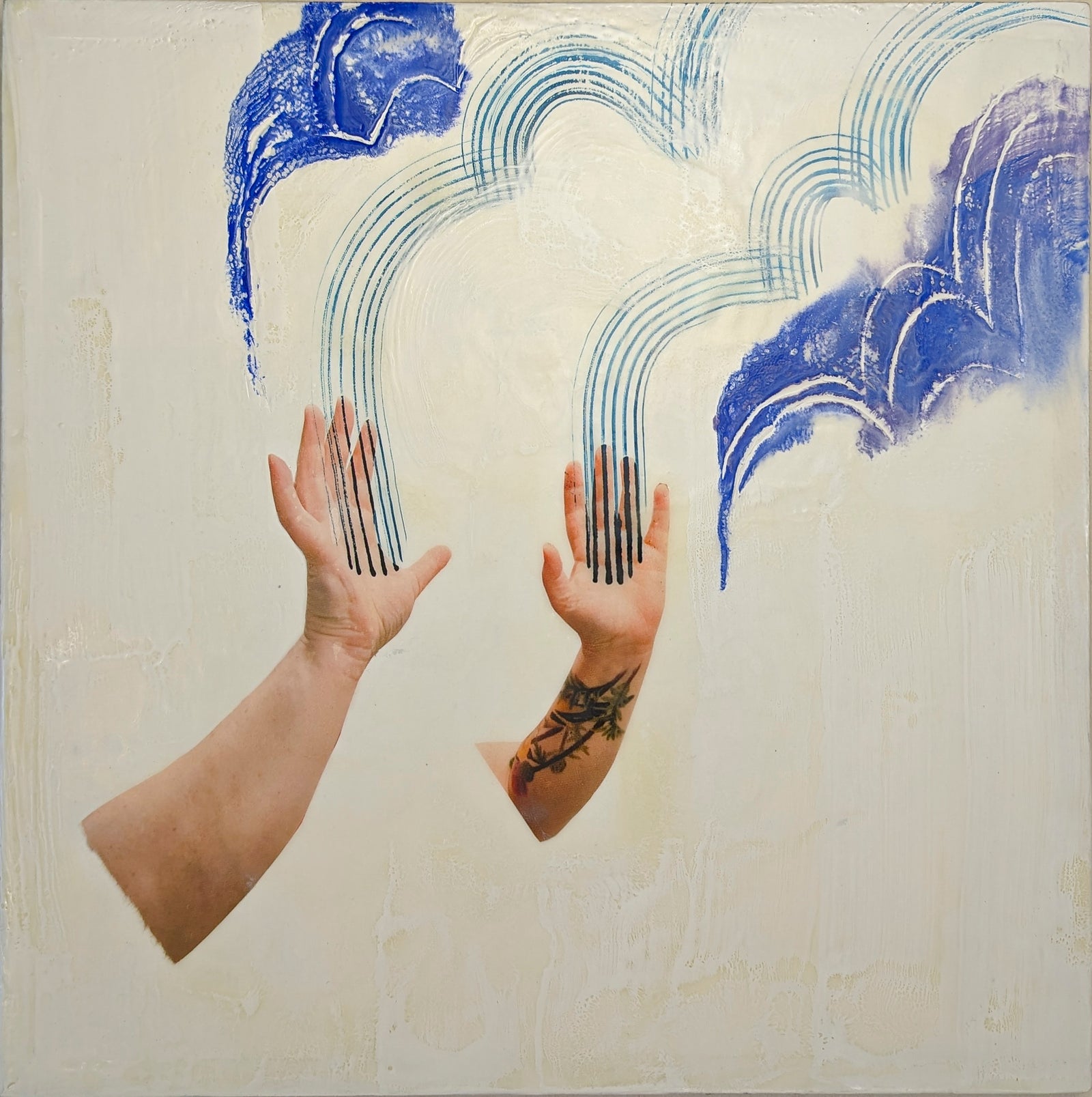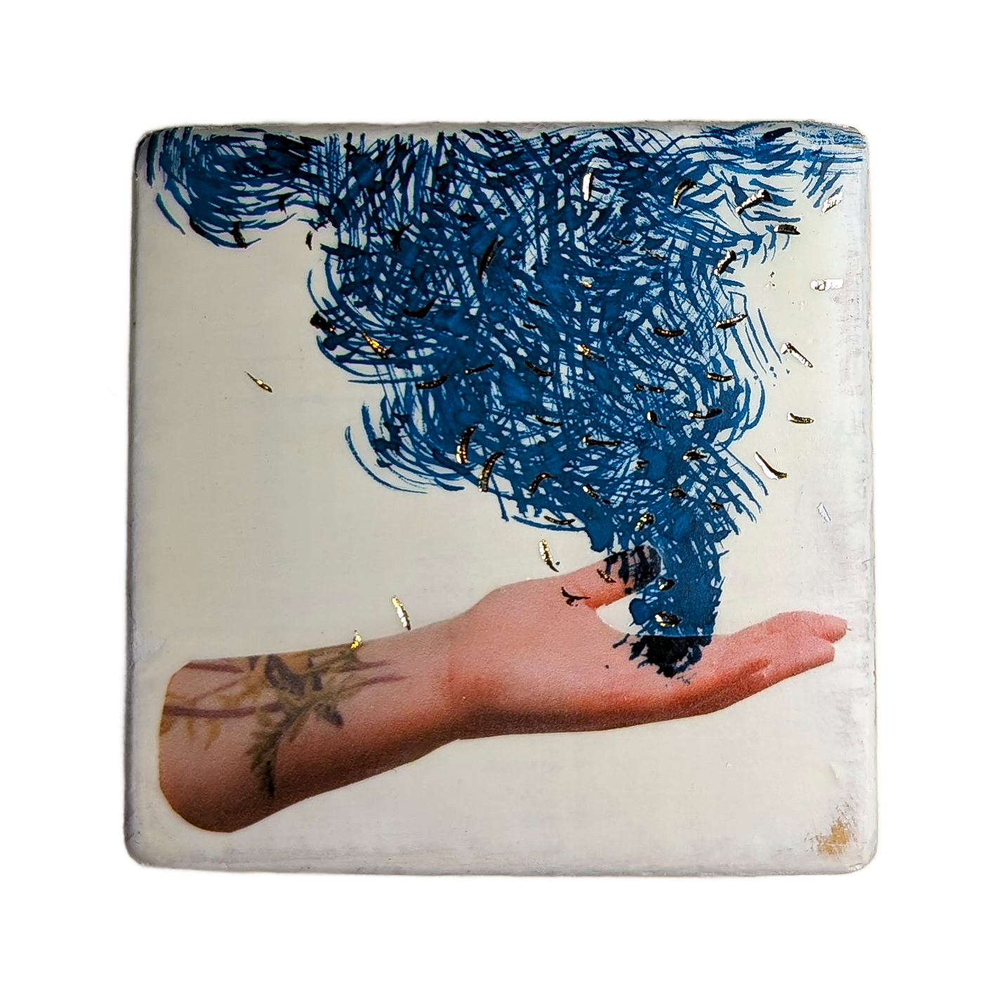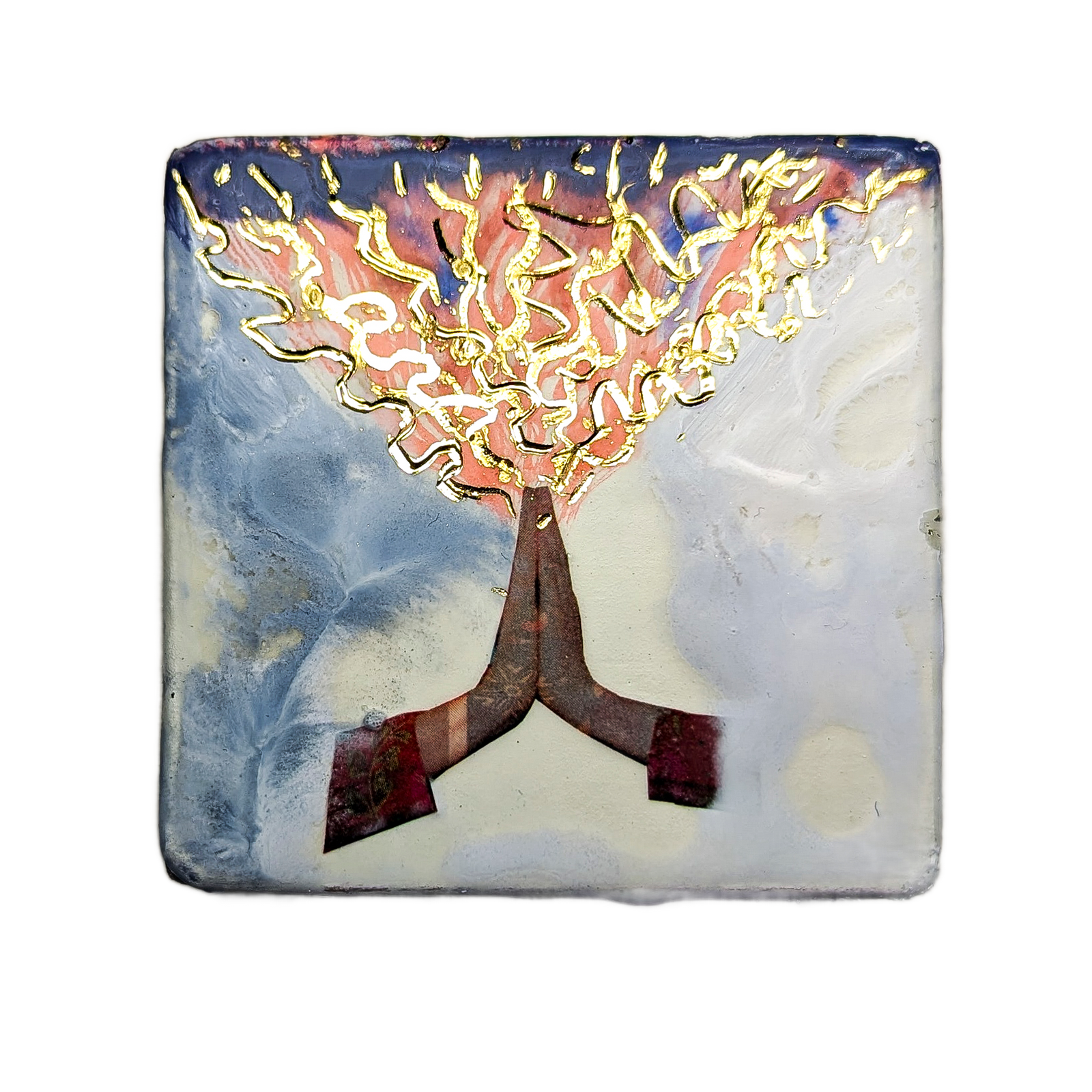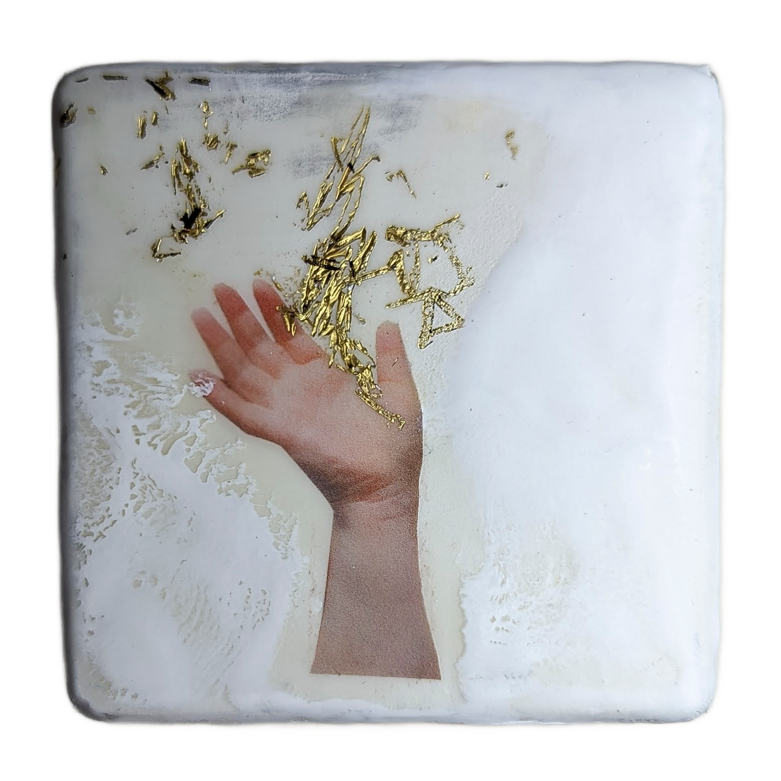 Encaustic collage on wood with foil accents. These pieces feature images of hands interacting with magical energies. Made in 2023.