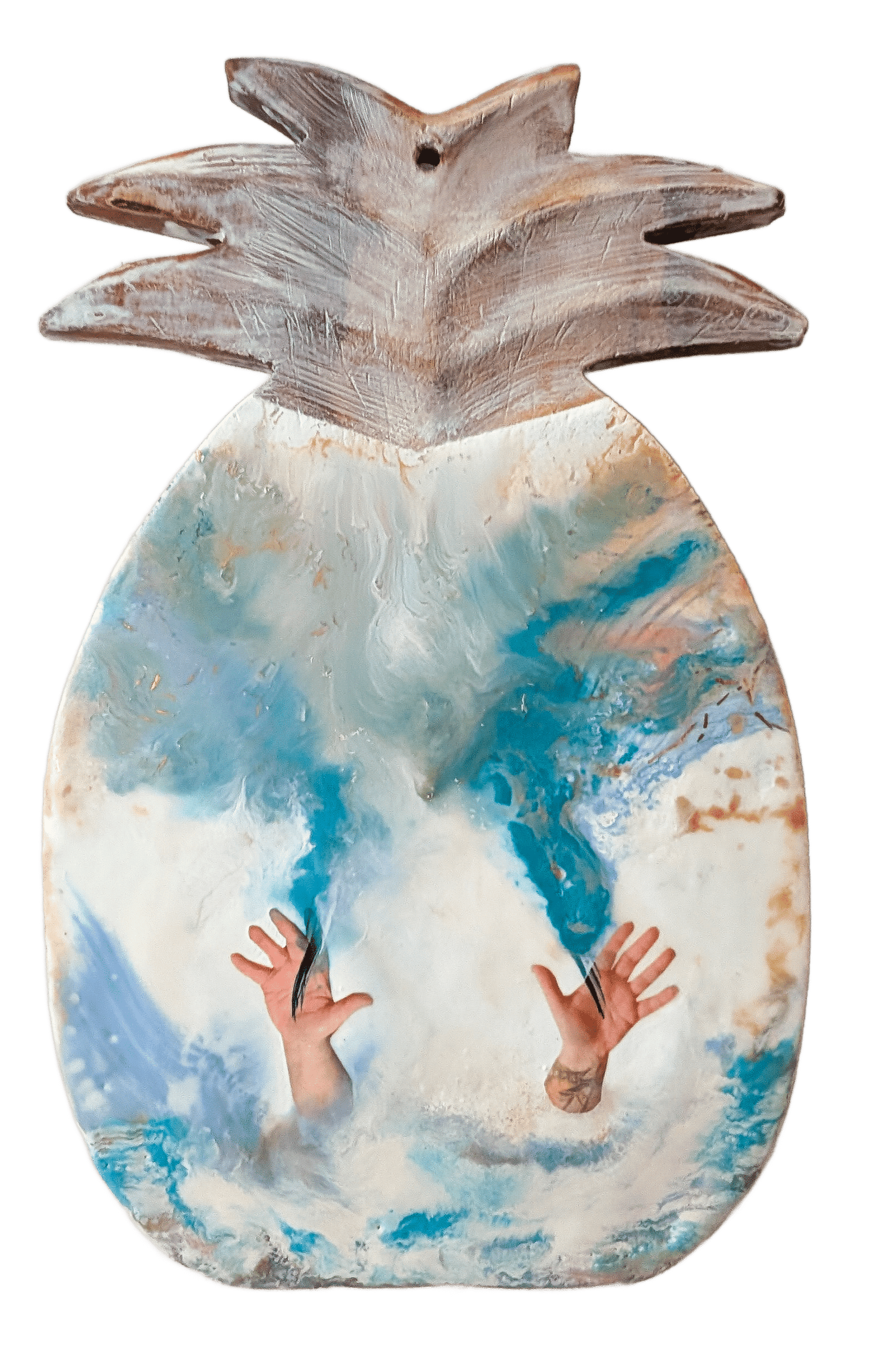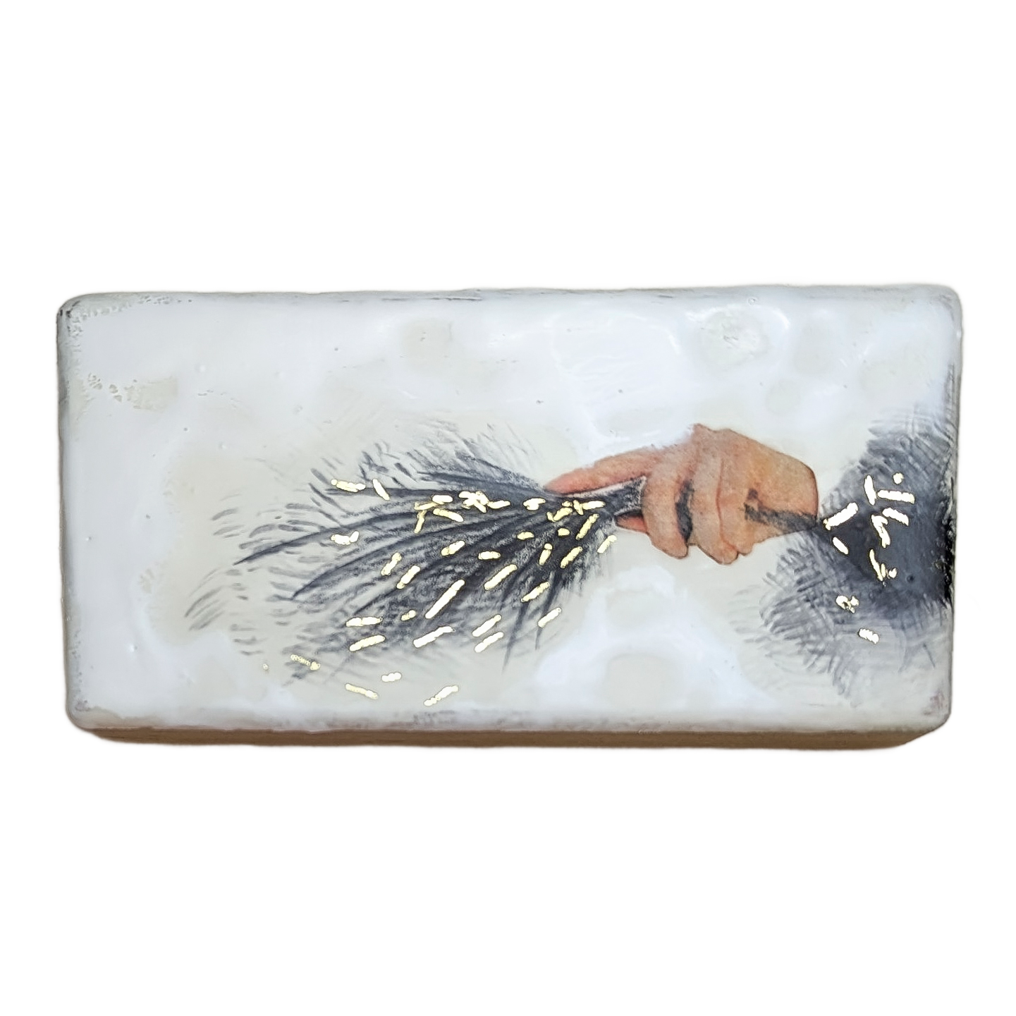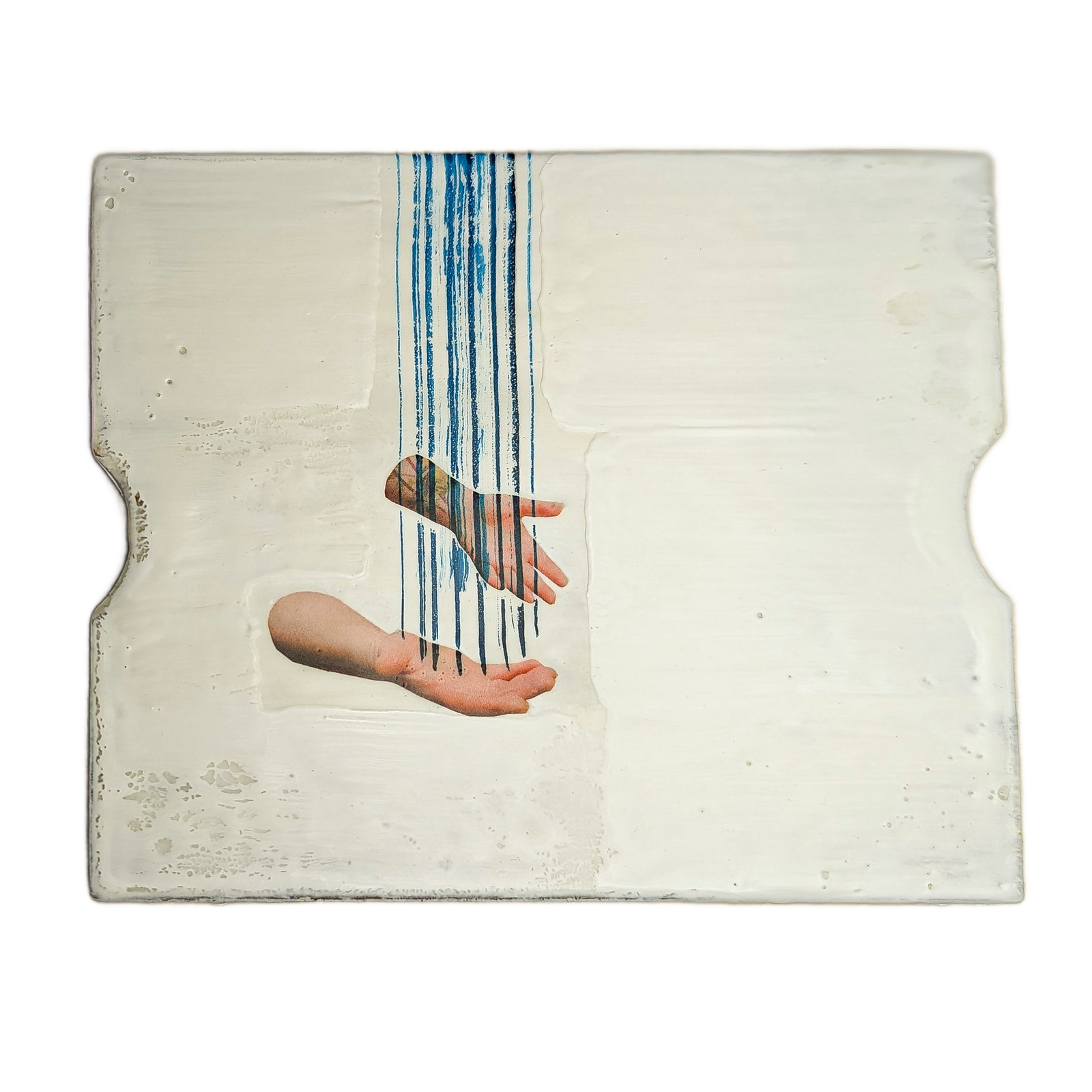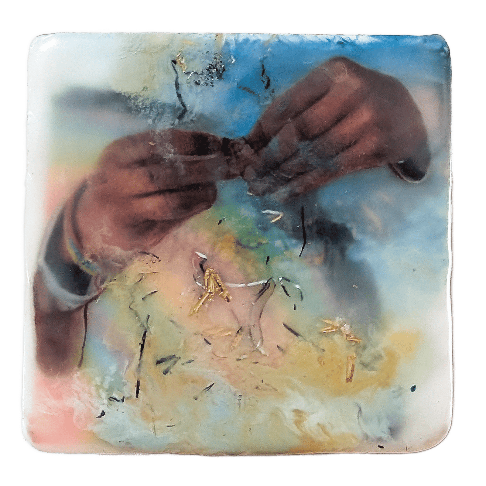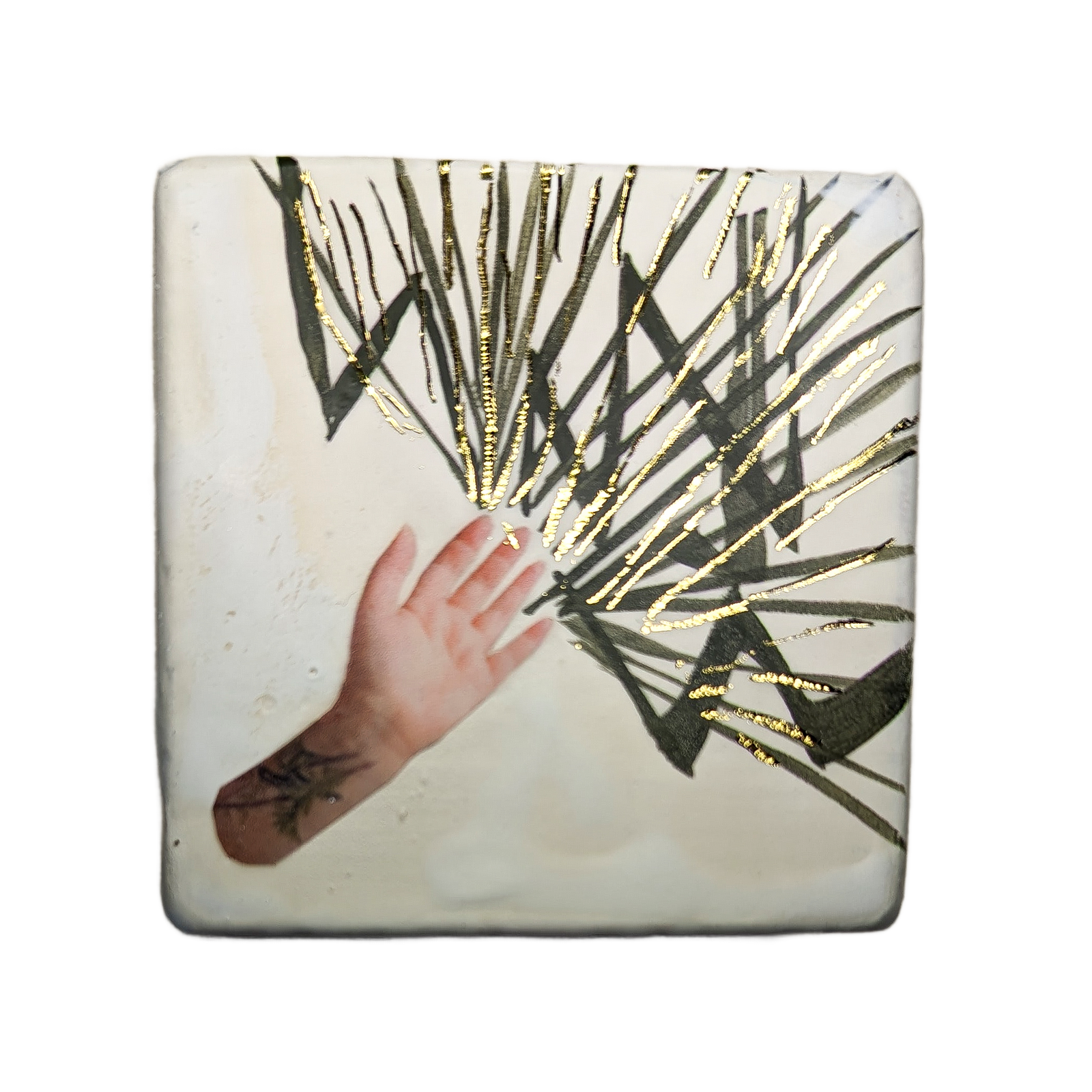 Encaustic collage on wood with foil accents. These pieces feature images of hands interacting with magical energies. Made in 2023.